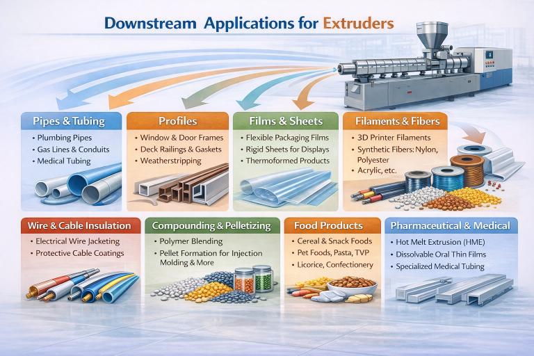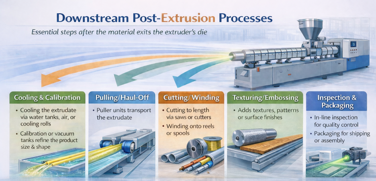 After the material exits the extruder’s die, a series of essential downstream operations take place to form, finish, and prepare the final product: