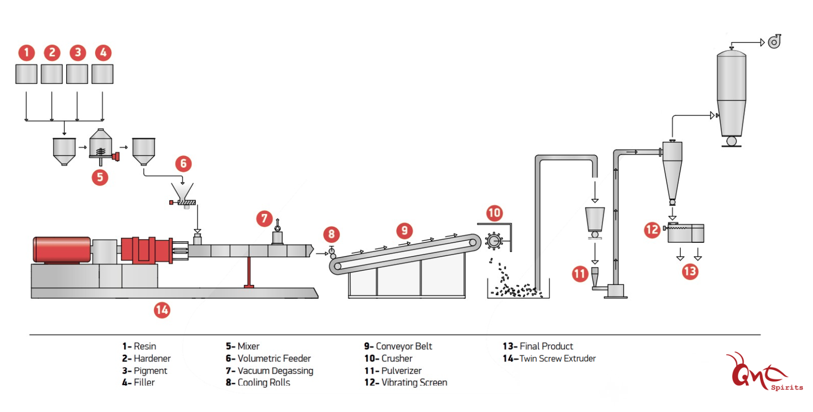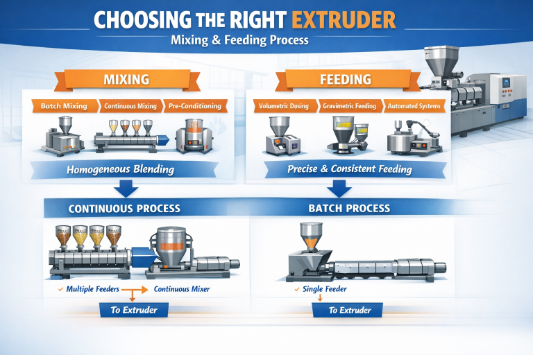 Mixing and feeding to an extruder involves combining raw materials for consistent quality and then precisely delivering them into the extruder. This process can be done in batches or continuously, with automated gravimetric feeders ensuring accuracy. Pre-mixing and conditioning the materials before they enter the extruder is crucial to prevent inconsistent quality, pressure fluctuations, and product defects.